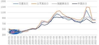 5月份,海外無縫鋼管 厚壁鋼管市場供需形勢得以改善,主要出口國家大幅下調無縫鋼管 厚壁鋼管出口報價。進入6月份,印度加征出口關稅一定程度提振了熱卷價格,各國出口報價基本穩(wěn)定,云商平臺監(jiān)測數據顯示,2022年6月8日,印度、土耳其、獨聯體和中國熱軋卷板出口報價(FOB)分別為850美元/噸、820美元/噸、740美元/噸和740美元/噸,與5月底基本持平。