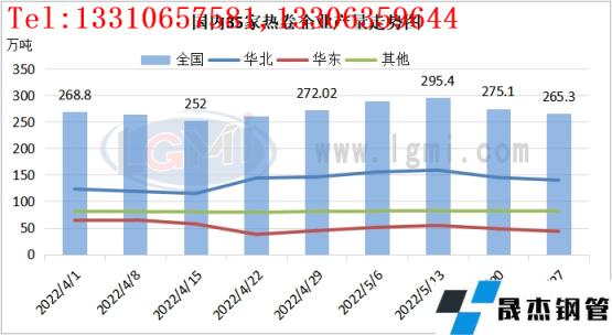 截止2022年5月27日,據云商平臺監測數據顯示,國內熱軋卷板社會庫存量約為243.71萬噸,環比增加10.72萬噸。重點城市庫存整體表現不一,華東、華南庫存小幅去庫,華北區域天津社會庫存有所累庫。具體來看,廣州地區熱卷社會庫存量約為61.91萬噸,環比減少3.05萬噸;上海熱卷社會庫存量環比減少0.21萬噸至41.84萬噸;天津熱卷社會庫存量約為7.20萬噸,環比增加1.58萬噸。