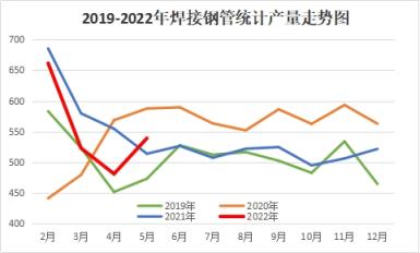 圖1 2019-2022年國內(nèi)焊接無縫鋼管產(chǎn)量示意圖