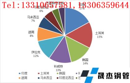 6月份我國無縫管的主要流向地區依次為印度、土耳其、韓國、科威特、伊拉克,占當月出口比重分別為7.86%、7.1%、6.32%、6.14%和,上述地區出口累計出口量占當月出口量32.9%。