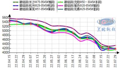 7月份國內優(yōu)特鋼市場價格大幅下跌。據(jù)云商平臺監(jiān)測數(shù)據(jù)顯示,截至7月29日,全國碳結鋼(45#)平均價格4347元,較上月同期跌500元左右;全國合結鋼(40Cr)平均價格4588元,較上月同期跌500元左右。因市場成交量較上個月稍有好轉,優(yōu)特鋼價格震蕩運行,無縫鋼管廠家出貨量稍有增加,無縫鋼管廠家庫存均有小幅下降,但社會庫存持續(xù)累積,市場價格短期低位震蕩為主。在價格企穩(wěn)反彈后,成交量稍有好轉,市場交投氛圍較為積極,剛需與投機均有成交,市場信心提振,不過受限于今年需求遠低于往年同期水平,需求端兌現(xiàn)仍然是一個漫長的道路。